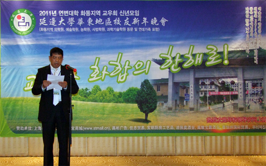 校友总会副会长、副校长朴永浩讲话。他代表校党委书记李勇、校长金柄珉向全体上海校友转达了全校师生员工的节日问候和祝福;着重介绍了母校2010年在教学、科研、师资队伍建设、校区扩建等方面取得的成就,简要介绍了教育基金会与校友总会办公室2010年的工作开展情况、2011年的工作规划及取得的成绩 — 教育基金会先后获国家民政部“全国先进社会组织”称号、吉林省首批公益性捐赠税前扣除资格和吉林省唯一一家