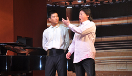 戴玉强先生在讲座中通过回顾自身的成长经历,着重阐述了自己对唱歌的感悟。他说,你的歌声已经包含了你的人生经历和感悟,有些人缺乏丰富的人生经历,没吃过苦,唱出的歌就只能像“白开水”一般没有内涵。千万不要小看人生中的挫折和磨难,再坚持一步,你可能就见到曙光。在谈到唱歌应具备的条件时,他强调,首先要有天赋,认清自己的长处和优势,千万别盲目。二是后天的学习。怎么学?一定要坚持正确的练习方法,循序渐进,打好扎实的基础,按规律办事。在接下来的现场点评环节里,戴玉强先生认真聆听四位学生的演唱,点评优缺点一语中的,语言通俗易懂,风趣幽默,道理讲解精到细致,举手投足间无一处不显露大师风范,精彩处博得专业师生的阵阵掌声和喝彩声。