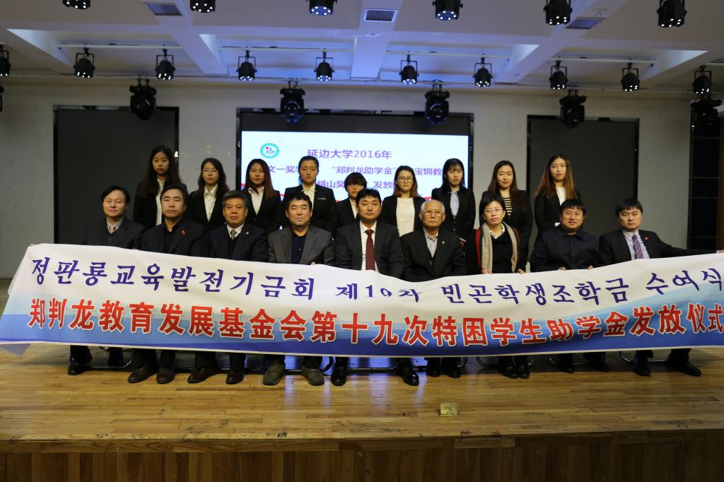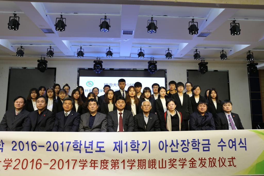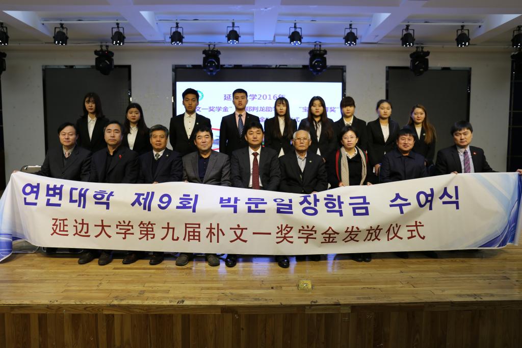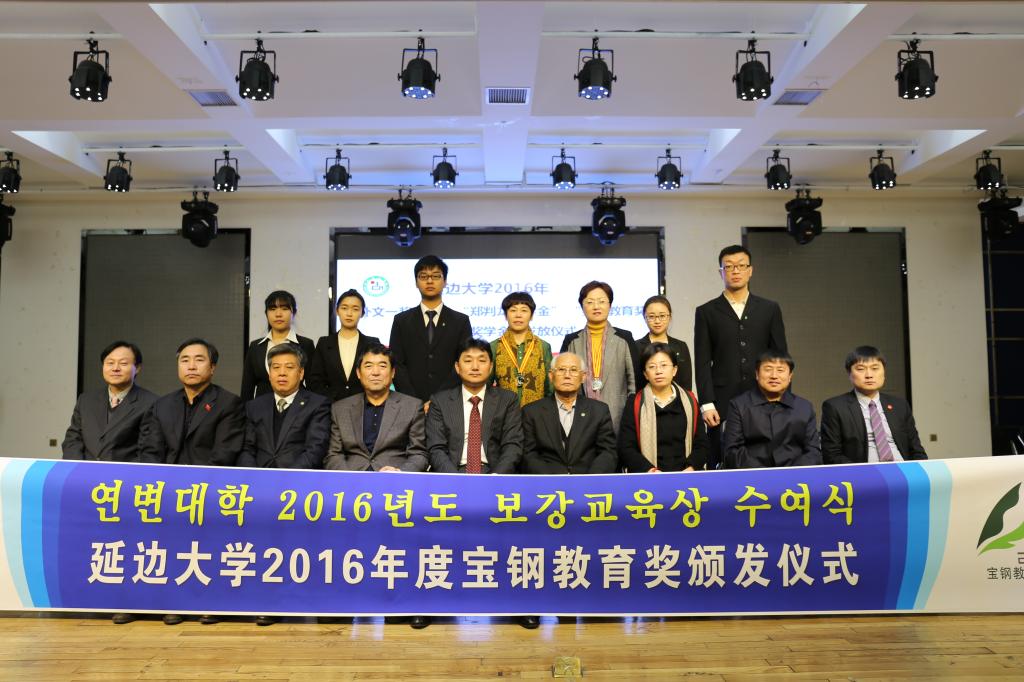 仪式上,郑光日宣读2016年“朴文一奖学金”、“郑判龙助学金”、“宝钢教育奖”、“峨山奖学金”获奖者名单。朴文一向“朴文一奖学金”获奖学生颁发证书及奖金;赵亮、李逢雨向“郑判龙助学金”获助学生颁发证书及助学金;梁仁哲向“宝钢教育奖”获奖教师及学生颁发证书、证章、光荣册及奖金;李昌善向“峨山奖学金”获奖学生颁发证书及奖金。