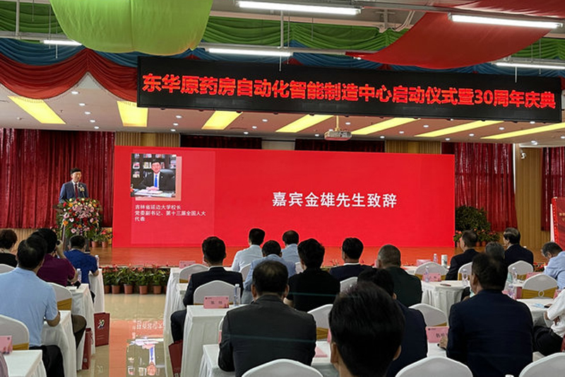 金雄校长作为嘉宾致辞。他首先祝贺东华原医疗三十周年华诞,并表示东华原医疗以“铸就百年基业,打造世界品牌”为企业愿景,始终秉持“质量就是企业生命”的理念,在南龙董事长的带领下,克服民营企业之艰难,不断成长进步,从中医医疗系列产品的推出,到中药煎药机行业标准、国家标准、国际标准的制定,实现了一次又一次的历史跨越,取得了一个又一个骄人的业绩。他希望东华原人以医疗药房自动化高端智能制造研发中心启动为契机,在核心技术、关键技术方面有新突破、新作为、新贡献;希望通过产教融合,加强与延大的合作,共同开展研发、共同培养医药人才,为中医药现代化发展和智慧医疗建设做出贡献。