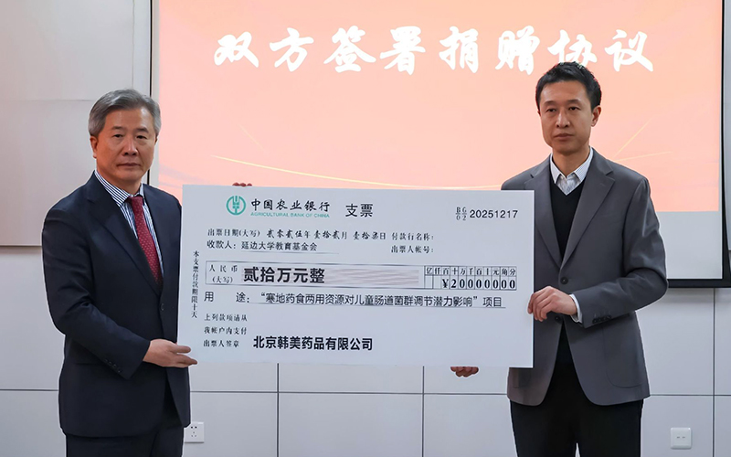 12月17日,延边大学“寒地药食两用资源对儿童肠道菌群调节潜力影响”基金捐赠仪式在药学院举行。北京韩美药品有限公司总经理任海龙、总监王宏宙、秘书于博颖、经理孙占清、经理宫伟,延边大学教育基金会·校友总会办公室李彦生主任、药学院党委书记修景会、院长朴光春、副院长姜国哲、专硕学科主任金莉莉,延边大学附属医院儿科主任元熙哲出席捐赠仪式,仪式由姜国哲主持。