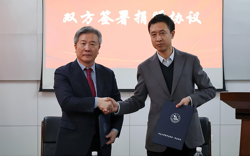 捐赠仪式上,李彦生与任海龙共同签署捐赠协议,并完成基金捐赠。修景会代表学校向任海龙赠送感谢牌。
