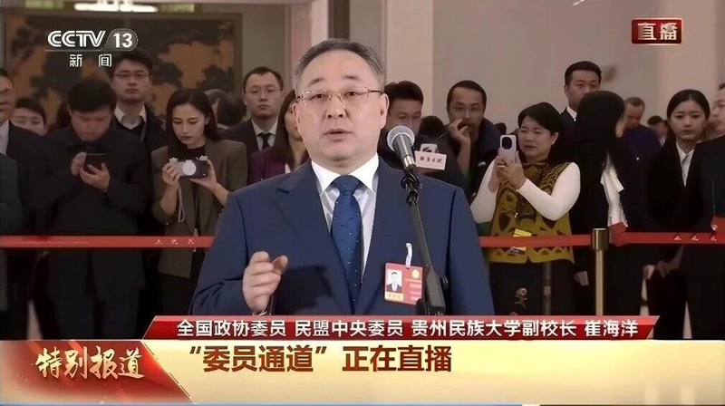 全国政协十四届四次会议第三场“委员通道”集体采访活动在北京人民大会堂举行。住黔全国政协委员、民盟贵州省委副主委、贵州民族大学副校长崔海洋走上通道,面对中外记者,讲述了互嵌式社区建设的故事。