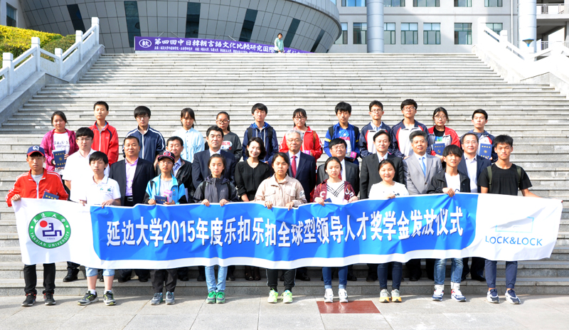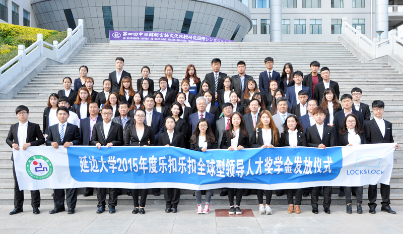 附注:延边大学2015年度“乐扣乐扣全球型领导人才奖学金”获奖学生共150名,共计42万元。其中延边大学本科生40名,每人3000元;研究生10名(含外国留学生一名),每人5000元;国际研究生院学生10名,每人1万元,共27万;延边州朝鲜族初、高中获奖学生90人,其中初中生60名,每人1500元;高中生30名,每人2000元,共15万元。
