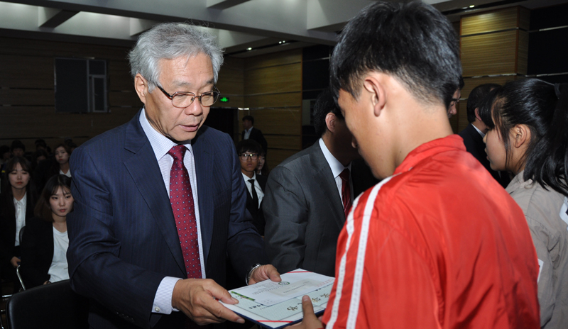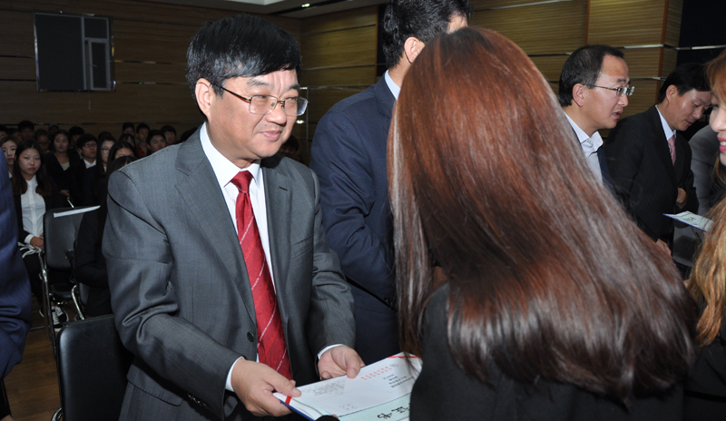仪式上,郑光日宣读了2015年度“乐扣乐扣全球型领导人才奖学金”获奖学生名单;参会来宾及学校领导共同为获奖学生颁发荣誉证书及奖学金。
