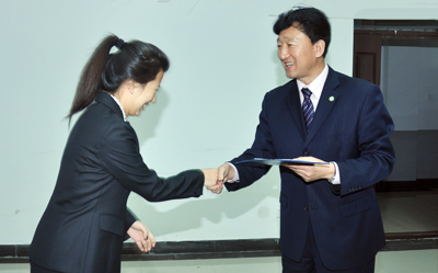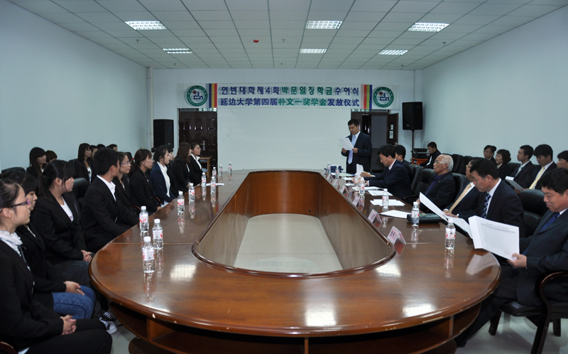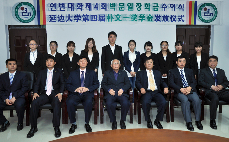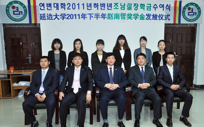仪式上,梁仁哲宣读了延边大学第四届“朴文一奖学金”、2011年“朴英爱奖学金”、2011年下半年“赵南哲奖学金”获奖学生名单。随后,朴文一和金雄共同向获奖的牟晓敏等22名学生颁发了荣誉证书及奖学金。