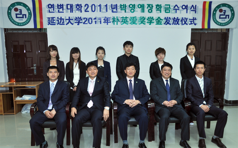 注:延边大学第四届“朴文一奖学金”获奖学生有10名,每人的奖学金额为2千元人民币,共计2万元人民币;2011年“朴英爱奖学金”获奖学生有6名,每人的奖学金额为2千元人民币,共计1.2万元人民币;2011年下半年“赵南哲奖学金”获奖学生有6名,其中2名研究生的奖学金额为2千元人民币,4名本科生的奖学金额为1千5百元人民币,共计1万元人民币。