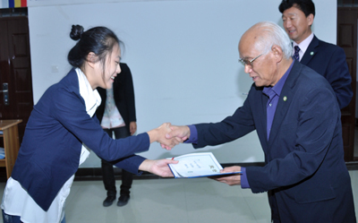 朴文一向获奖学生表示祝贺,他强调学校要以人为本和以教育为先,号召同学们首先要多读书,读好书。在学好自己的专业知识外,多探讨和阅读世界名著,了解其专业历史。二要珍惜时间、爱惜时间,不要浪费一分一秒。三要对父母的养育、学校的培育、社会各界的资助存有感恩之情,使之变为学习成长的动力,加倍学习,成为对社会有用的人。最后他倡议同学们要多参加体育锻炼。