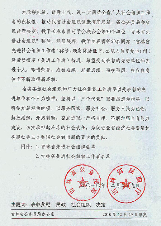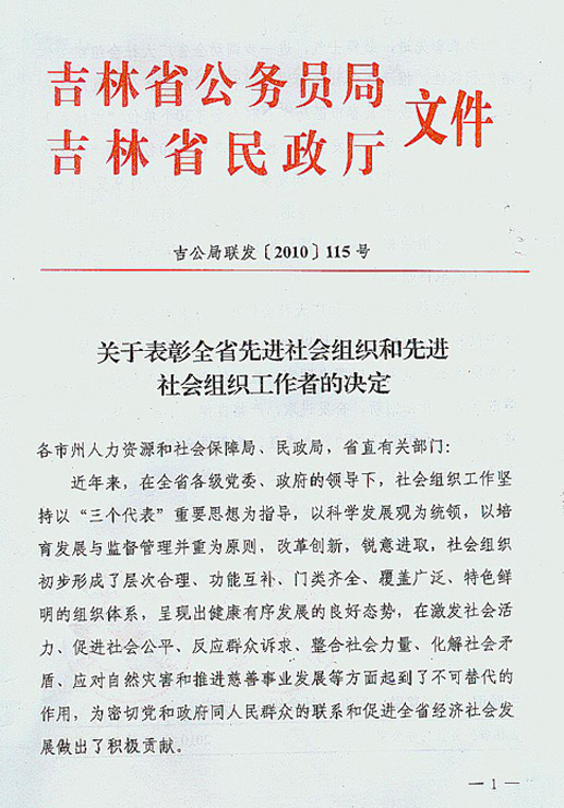 为了表彰先进,鼓舞士气,进一步调动全省广大社会组织工作者的积极性,推动我省社会组织健康有序发展,省公务员局和省民政厅于2010年联合组织了评比全省先进社会组织和先进社会组织工作者的活动。经省民政厅社会公示后,省公务员局和省民政厅正式下发了《关于表彰全省社会组织和先进社会组织工作者的决定》(吉公局联发〔2010〕115号),我校教育基金会金日秘书长荣获省先进社会组织工作者称号。