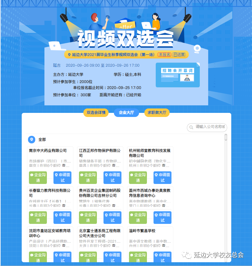 为进一步贯彻落实党中央、国务院关于促进高校毕业生就业工作的决策部署,推进毕业生充分就业,我校结合疫情防控期间的工作安排,通过线上网络平台,分别于2020年9月26日、27日举办2021届毕业生秋季网络视频双选会和2021届毕